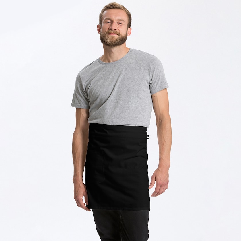 Grembiule corto in cotone ecologico certificato e certificato Fairtrade. Certificato secondo Fairtrade, EU Ecolabel, SA8000 e Oeko-tex. Sul lato grembiule c'è una tasca. Il grembiule è dotato di etichette che mostrano che è certificato Fairtrade e proviene da Neutral.