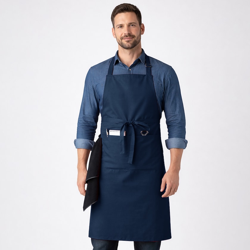 Grembiule economico con due tasche sul davanti. Il grembiule è realizzato con 80% di poliestere e 20% di cotone, il che conferisce un tessuto resistente in grado di sopportare molti lavaggi.