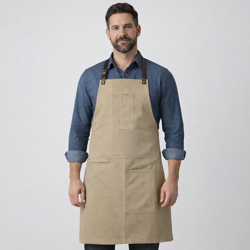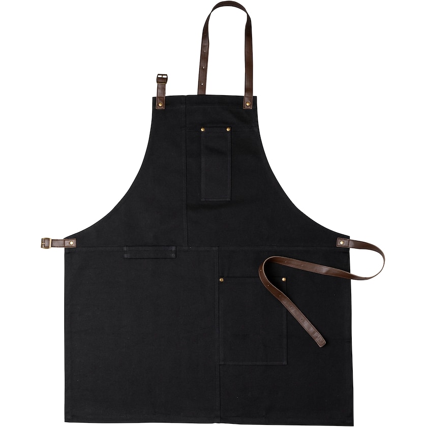 Grembiule di design in cotone. I cinturini sono realizzati in simil pelle. Sul davanti si trovano una tasca grande e una piccola.