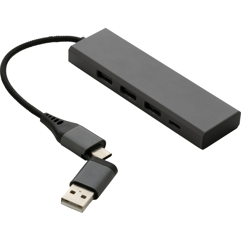 Hub USB ecologico in materiale riciclato. Campton è realizzato in alluminio riciclato, ABS, TPE e PET. Questo hub USB è dotato di tre porte USB A 2.0 e di una porta di tipo C. Il cavo è lungo 10 cm. Viene consegnato all'interno di una confezione regalo di cartoncino certificato FSC.