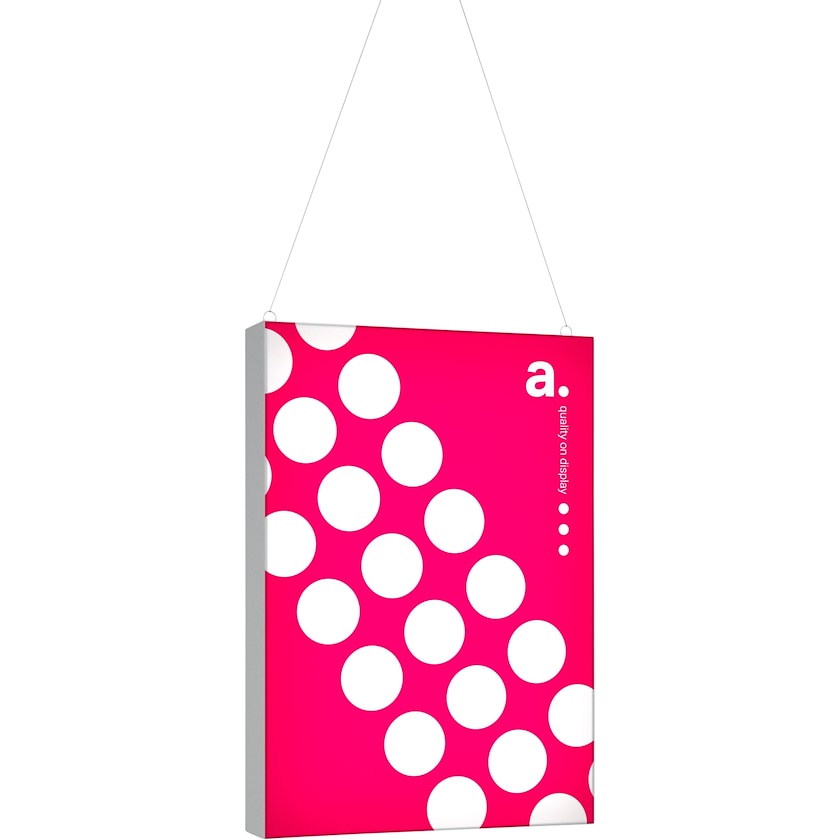 Piccola insegna luminosa che si appende al soffitto. L'insegna si illumina grazie a un sistema di lampade LED all'avanguardia che garantisce di illuminare l'intera fantasia. La fantasia viene stampata su un tessuto in poliestere con un metodo di stampa particolarmente elaborato che assicura dettagli nitidi e colori brillanti. La fantasia viene posizionata su entrambi i lati dell'insegna. Quando vorrai cambiare la fantasia ti basterà ordinare un nuovo tessuto da noi. Il montaggio è rapido e semplice.