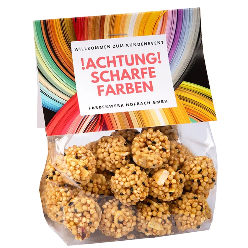 Grande sacco pieno di palline di muesli con una corta etichetta personalizzata. Le palline di muesli sono fatte di quinoa, cocco, semi di sesamo e semi di girasole e sono speziate con curry e un po' di peperoncino. Un'alternativa salutare a patatine, caramelle o cioccolato.
