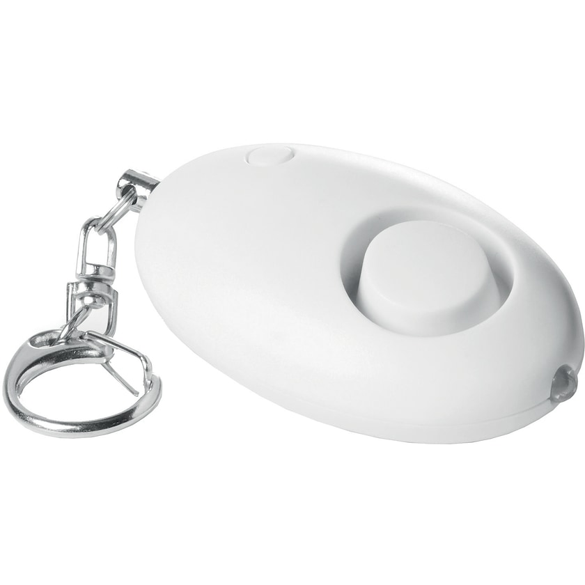 Allarme antipanico con portachiavi. L'allarme viene azionato quando si tira fuori il portachiavi dal suo attacco. Sono incluse le batterie. L'allarme ha anche una luce LED bianca.