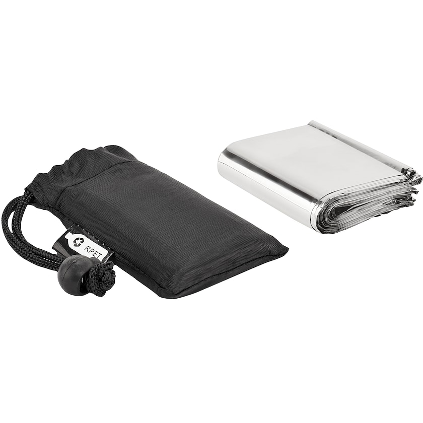 Coperta isotermica d'emergenza ecologica con custodia. Questa coperta isotermica d'emergenza è realizzata in plastica ricoperta da uno strato di alluminio che riflette il calore verso il corpo per prevenire l'ipotermia. La custodia è realizzata con bottiglie di PET riciclate.