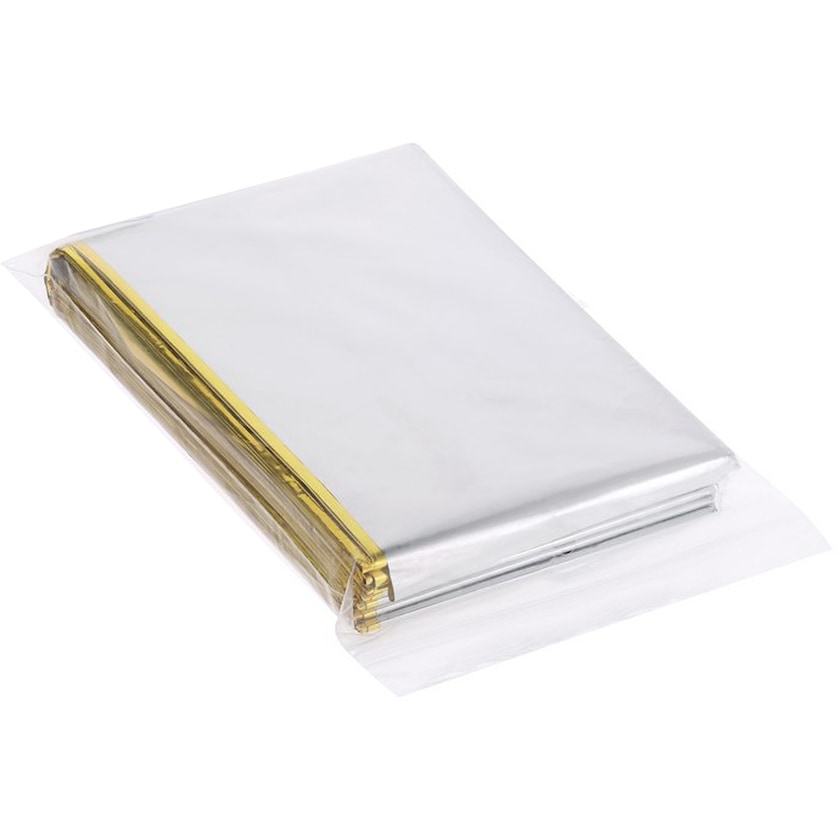 Coperta isotermica in pratico formato tascabile. Riflette il calore corporeo, tenendoti al caldo e permettendoti di conservare il calore. La stampa viene realizzata su un adesivo sulla confezione.