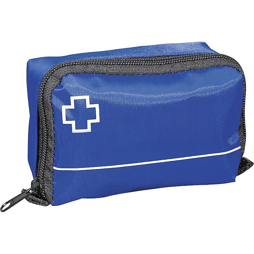 Un gadget promozionale che può salvare la vita. Contiene: 1 mascherina per respirazione bocca a bocca, 1 piccolo rullo di bende 5x450cm, 2 salviette disinfettanti, 1 cerotto ampio (7x20cm), 2 salviette umidificate, 5 cerotti, 1 benda di compressione, 1 forbice, 1 nastro adesivo, 1 pinzetta, spille da balia, 1 paio di guanti di plastica, 1 fascia per braccio