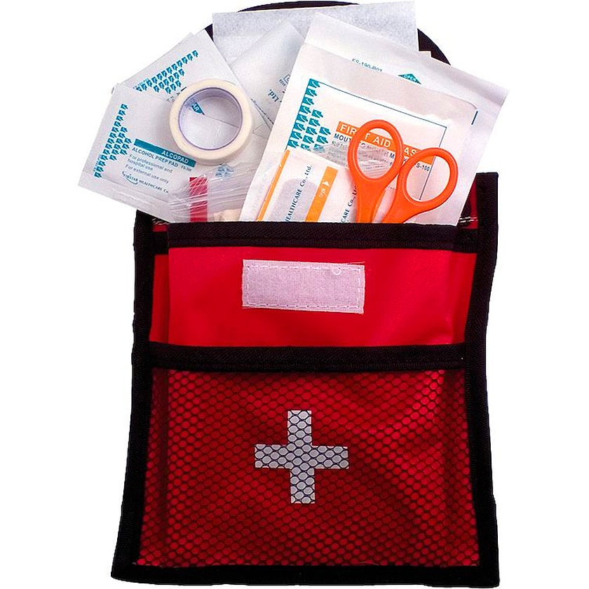 10 cerotti, garza per gli occhi, 1 cerotto grande (7 x 20 cm), 3 salviette disinfettanti, 1 maschera protettiva per respirazione bocca-a-bocca, 1 bendaggio a tracolla, 2 garze di compressione, 1 paio