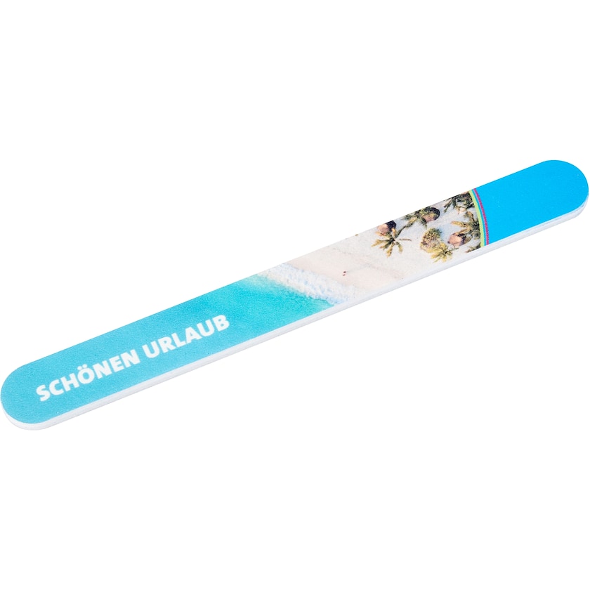Lima per unghie professionale di alta qualità per saloni di bellezza. È bianca in origine e può essere personalizzate con stampa su di un lato. L'interno della lima è realizzato in plastica mentre la superficie è in carta vetrata. Una pratica custodia in plastica può essere acquistata separatamente come accessorio.