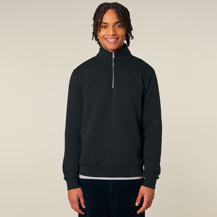 Felpa senza cappuccio in modello unisex con cerniera corta al collo. Il tessuto è realizzato in 85% cotone ecologico e 15% poliestere riciclato.