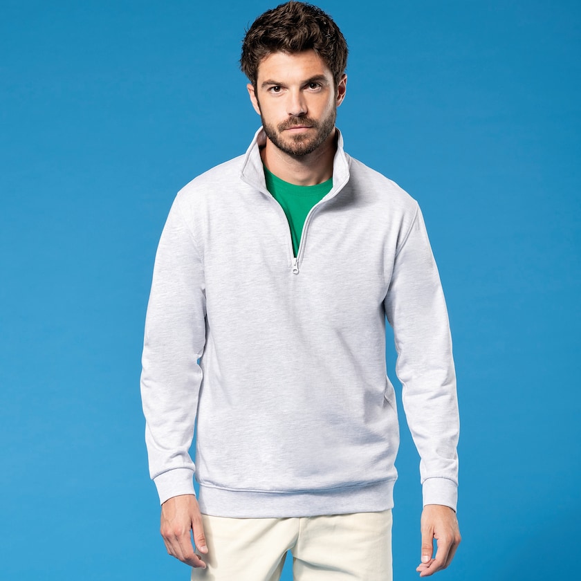 Felpa trendy con cerniera lampo corta sul collo. Disponibile in tanti colori alla moda. Viene confezionata singolarmente in busta di plastica.