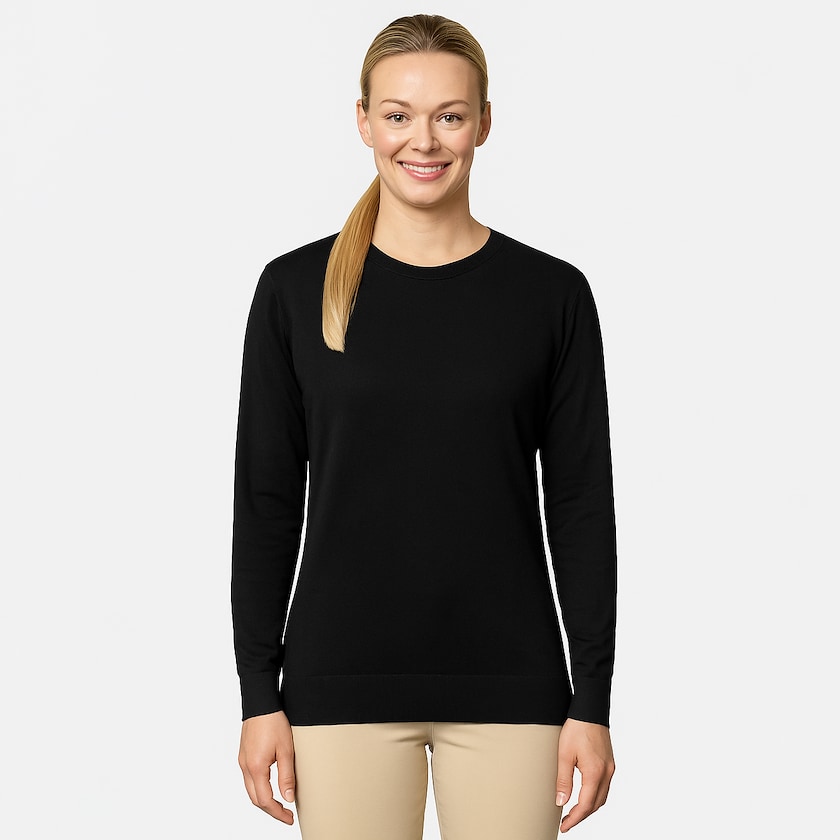 Maglioncino girocollo da donna. Questo maglioncino è realizzato in morbido tessuto di 80% viscosa e 20% nylon. Il logo viene ricamato.