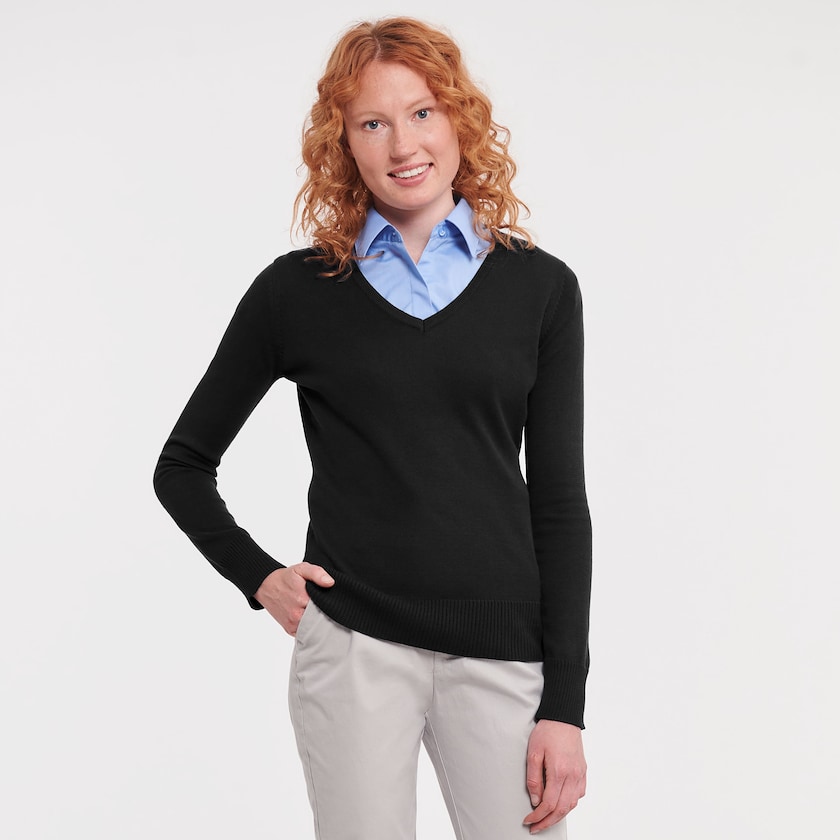 Elegante maglioncino da donna. Questo maglioncino ha lo scollo a V ed è realizzato in tessuto misto di cotone Easy Care che combina la leggerezza del cotone alla morbidezza dell'acryl. Lavabile a 40 gradi e asciugabile in asciugatrice. Un maglioncino elegante per chi cerca un'alternativa un po' più elegante. Confezionato singolarmente in busta di plastica. Disponibile anche in versione da uomo.