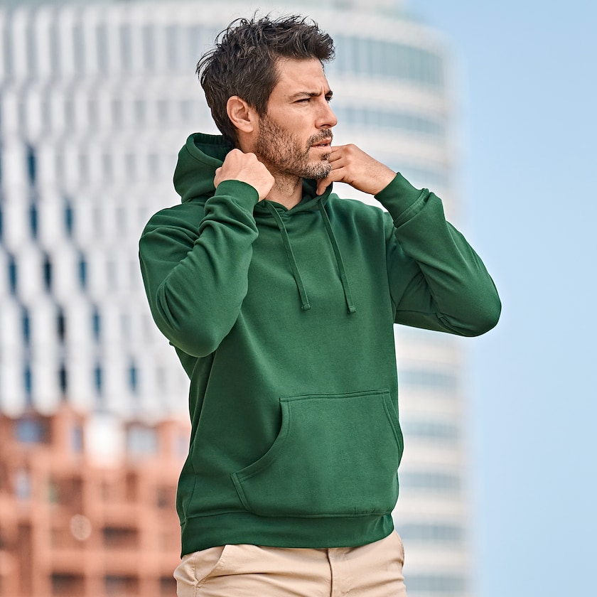 Elegante felpa con cappuccio personalizzata Tee Jays. La felpa è realizzata in 70% cotone biologico e 30% poliestere. Il tessuto è stato tinto due volte e i polsini sono elasticizzati.