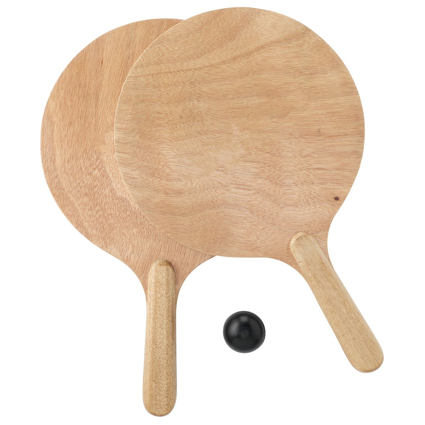Pregiato set per tennis da spiaggia personalizzato. Le racchette sono realizzate in fibra di legno MDF ricoperta di legno di pioppo. La pallina è realizzata in gomma. Viene consegnata all'interno di una busta di cotone. È solo possibile la stampa a un colore. Il prezzo di stampa si riferisce alla stampa su entrambe le racchette.