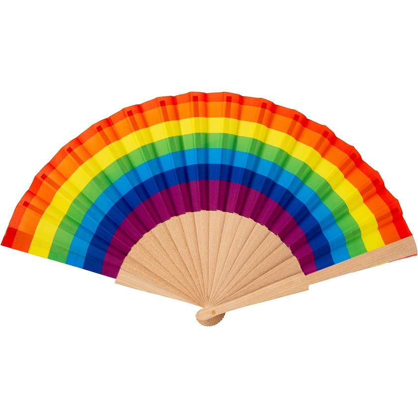 Ventaglio con tessuto arcobaleno. Realizzato in poliestere e legno.