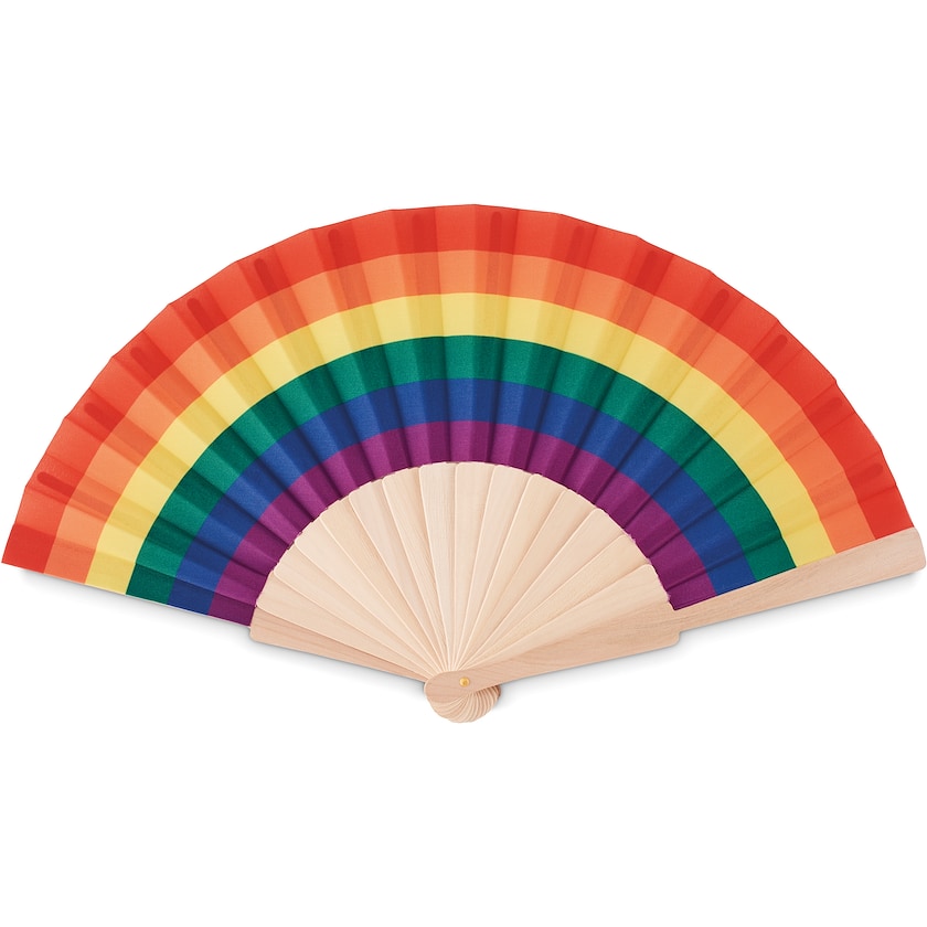 Ventaglio arcobaleno. La struttura è realizzata in legno, mentre il tessuto è in poliestere. Il logo può essere stampato oppure inciso a laser sulla struttura in legno.
