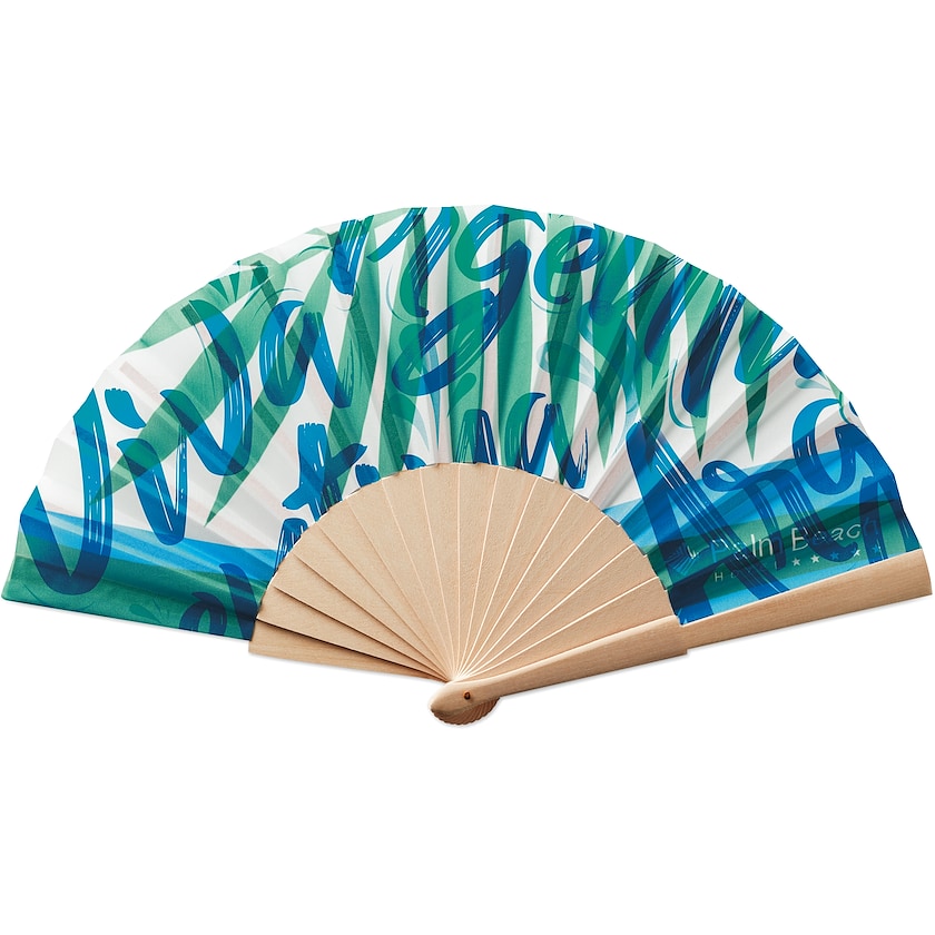 Ventaglio in legno con stampa digitale. La stampa viene realizzata su un lato del tessuto mentre il retro è bianco. Il ventaglio ha 14 stecche e due estremità. Dato che il ventaglio viene prodotto dopo l'ordine, il tempo di consegna è più alto del solito.