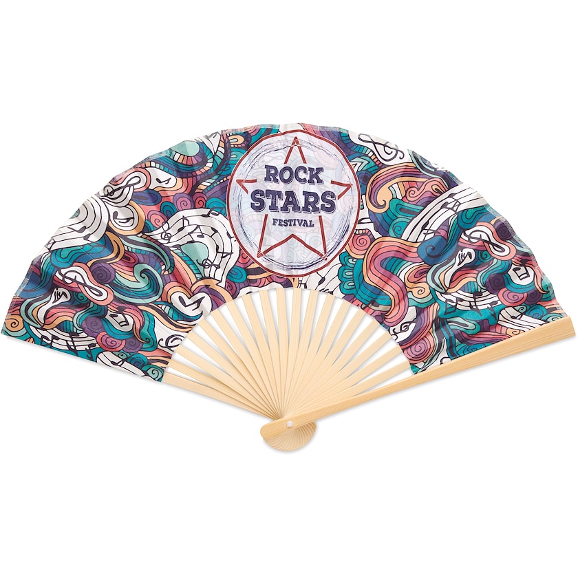Ventaglio interamente personalizzato con stampa su di un lato. Zaragoza è realizzato con bambù e con carta da 80 grammi. È possibile personalizzare secondo i tuoi desideri l'intera superficie stampata come nella foto. Scarica il modello di stampa e crea subito un ventaglio unico!