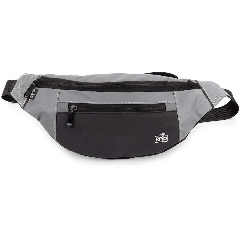 Marsupio ecologico con tessuto riflettente. Il marsupio ha due tasche dotate di cerniera. Dotato di una speciale superficie che impedisce lo RFID-skimning.