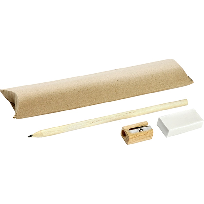 Piccolo set con matita, gomma da cancellare e temperino. Questo set è confezionato in custodia di cartone di colore neutro.