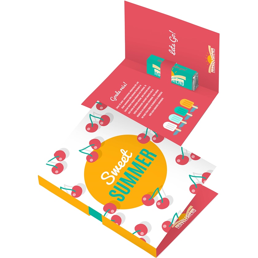 Piccola confezione di mentine attaccata a un cartoncino. L'intera confezione viene personalizzata secondo i tuoi desideri. Infatti, entrambi i lati del cartoncino vengono stampati apposta per te. Un gadget personalizzato per chi cerca un messaggio pubblicitario più sofisticato.