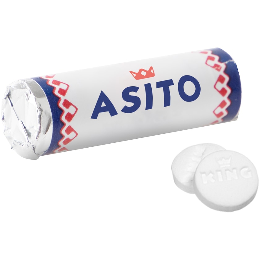 Piccolo tubo pieno con 9 mentine rinfrescanti. L'intero involucro che avvolge il tubo viene personalizzato secondo i tuoi desideri.