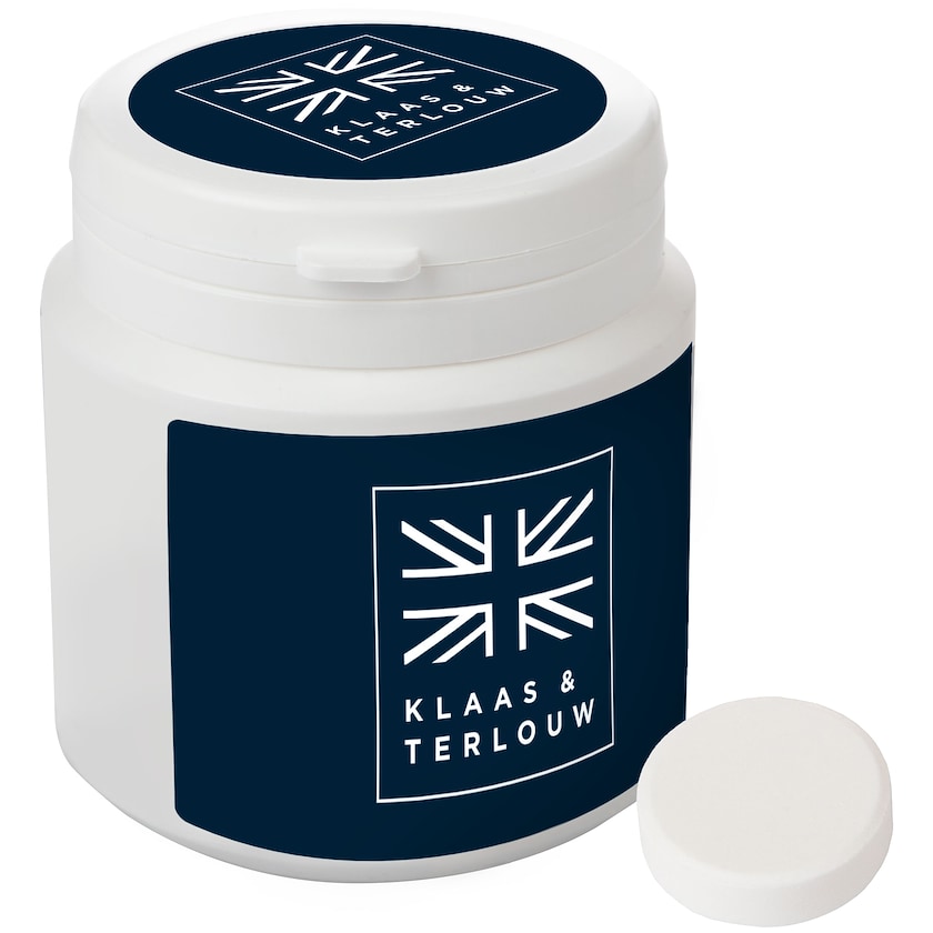 Barattolo pieno di 160 grammi di mentine. Un'etichetta con la tua stampa viene posizionata sul barattolo e sul tappo del barattolo.