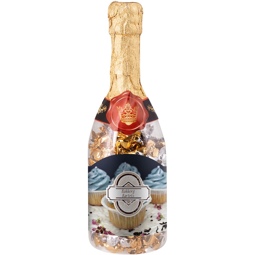 Bollicine? Divertente bottiglia di champagne piena di caramelle. Contiene 350 grammi di caramelle. Questa bottiglia è dotata di un'etichetta che viene stampata secondo i tuoi desideri. Non è possibile personalizzare le caramelle.