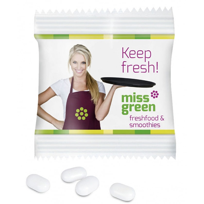 Bustina di rinfrescanti Tic Tac. Contiene circa 5 grammi di Tic-Tac alla menta o all'arancia. La confezione è realizzata in carta.