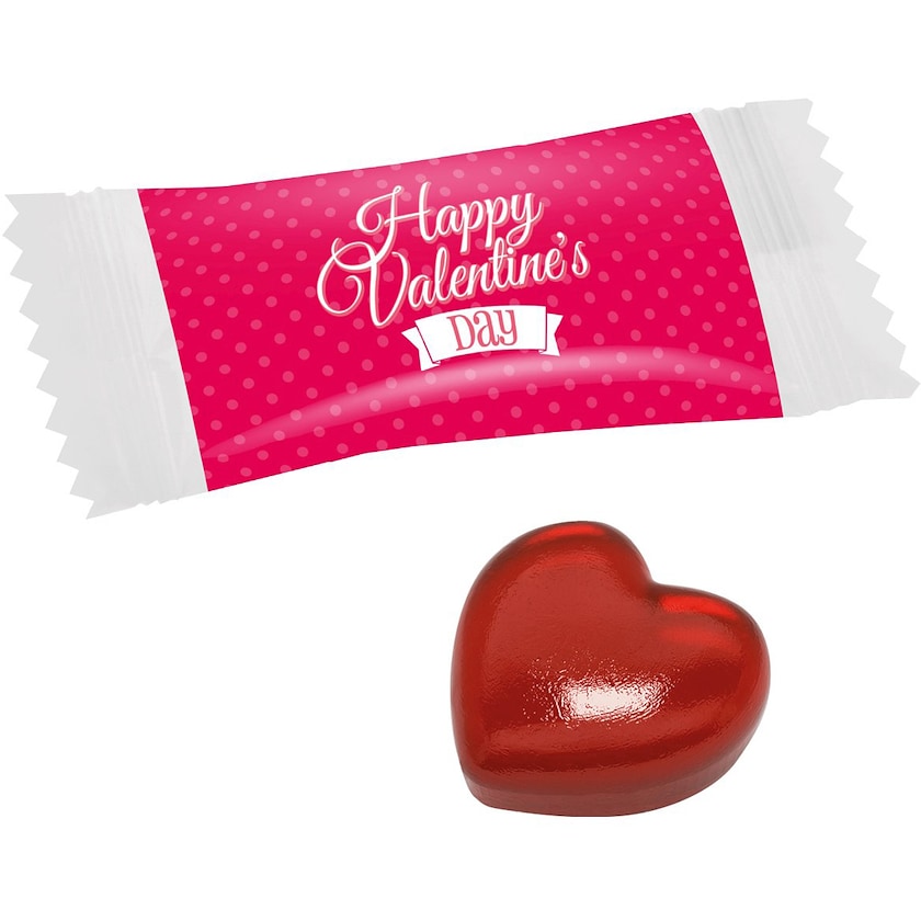 Dolci a forma di cuore in flowpack. L'intero pacchetto può essere progettato secondo i vostri desideri. Una caramella che consente di mostrare i tuoi sentimenti!
