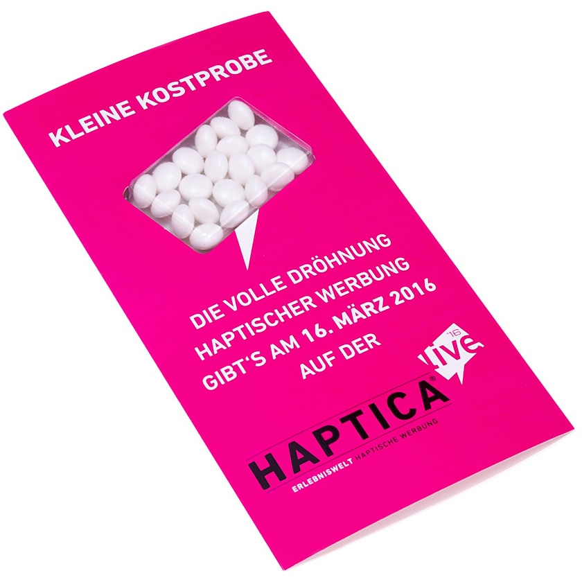 Confezione Blister con 4 grammi di mentine. Le finestre sono disponibili in tante forme diverse e la confezione viene stampata digitalmente. Vengono stampate il fronte e retro. Le mentine vengono fornite in tanti gusti e possono essere mischiati a vostra volontà. Caramelle promozionali con un grande valore pubblicitario!