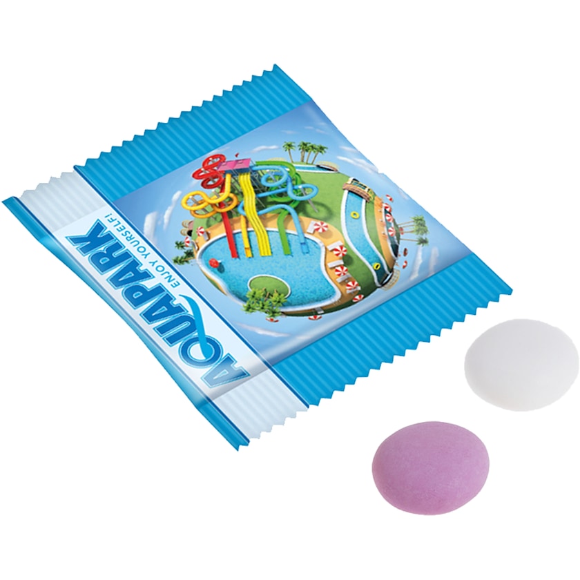 Due Mentos in confezione flowpack con stampa personalizzata. Scegli tra Mentos ai gusti menta e mix di frutta. L'intera confezione flowpack viene stampata secondo i tuoi desideri.