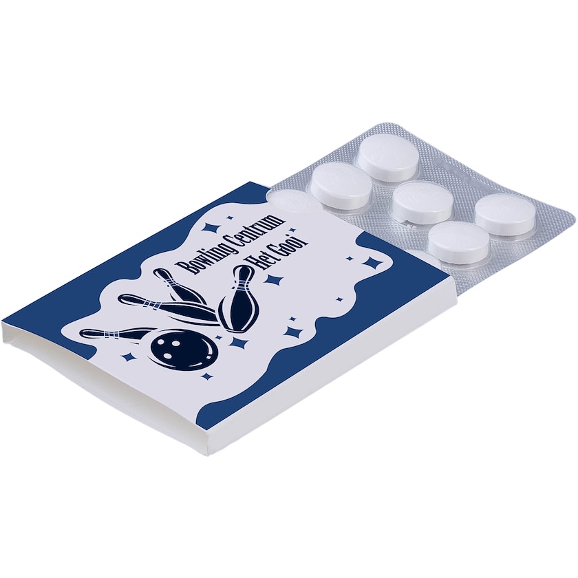 Scatola con 10 mentine senza zucchero, in blister con rivestimento in carta personalizzata con stampa digitale.