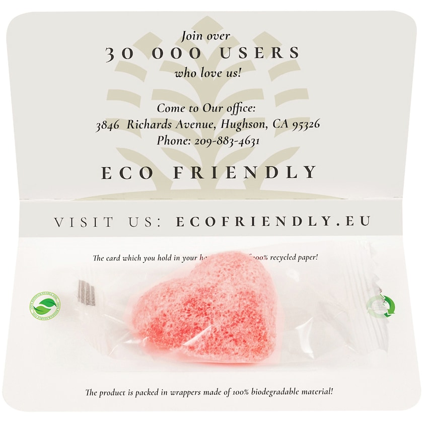 Una gelatina a forma di cuore attaccata a una cartolina. La confezione della gelatina è 100% biodegradabile. La cartolina è perforata così da poter essere agevolmente staccata e usata come coupon.