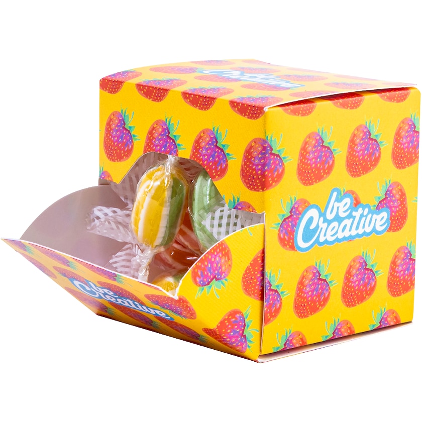 Scatola piena di 40 grammi di caramelle alla frutta. La superficie della scatola viene personalizzata secondo i tuoi desideri. Le caramelle sono confezionate con incarto trasparente e sono disponibili in gusti alla frutta misti. La stampa non è realizzabile sull'incarto delle caramelle.