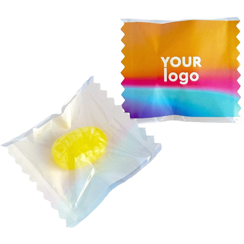 Caramelle senza zucchero personalizzate. Ogni caramella è confezionata con incarto Flow Pack personalizzato sulla parte superiore. Scegli tra i gusti citrus mix e mentolo.