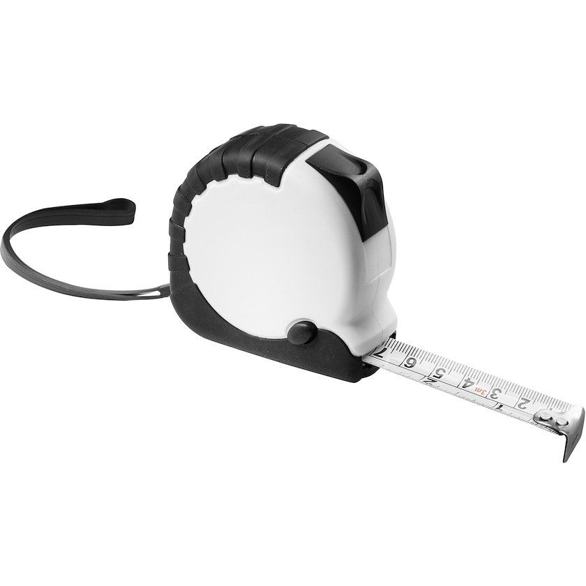 Metro a nastro bianco con dettagli in gomma nera. Il metro a nastro misura 3 metri. Sul retro si trova un fermaglio in metallo che permette, ad esempio, di attaccarlo comodamente alla cintura.