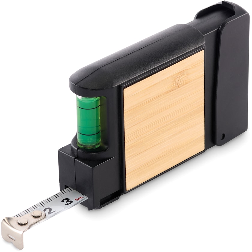 Metro a nastro con livella a bolla d'aria e set di cacciaviti. Il metro è realizzato in metallo e il rivestimento è realizzato in ABS e bambù.