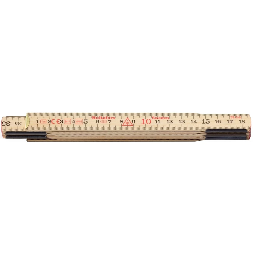 Metro pieghevole senza tempo Hultafors in versione da 1 metro. Questo metro pieghevole è realizzato in legno di betulla con giunture in acciaio svedese. La gradazione metrica è in nero con i decimetri in rosso ed è presente su entrambi i lati.