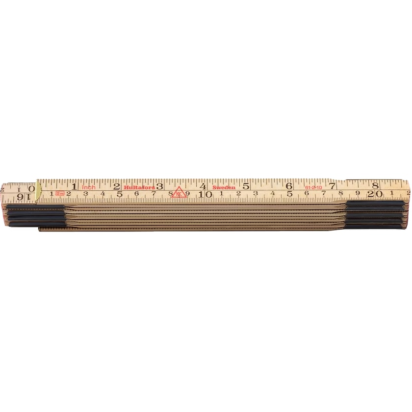 Un classico metro pieghevole della marca svedese Hultafors. Realizzato in legno di betulla con giunture in acciaio svedese. Gradazione in nero su entrambi i lati: sistema metrico sul bordo inferiore e sistema inglese (pollici) su quello superiore.