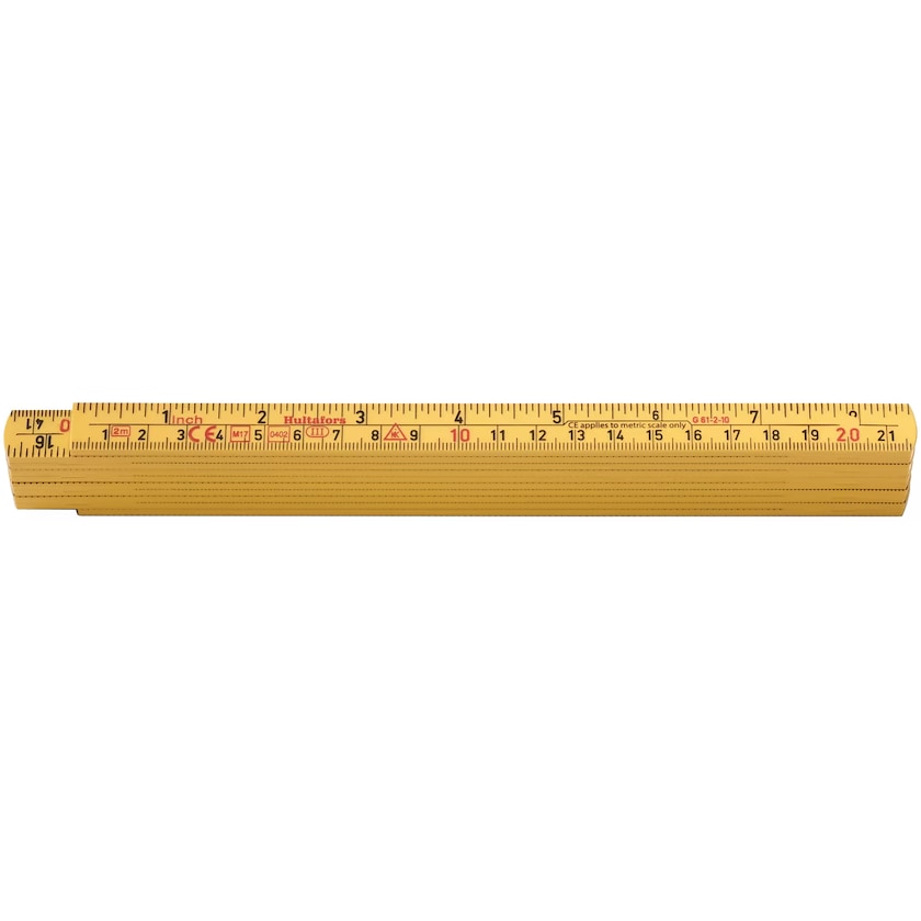 Metro pieghevole giallo in poliammide rinforzato con fibra di vetro. Questo materiale resiste benissimo all'umidità. La gradazione metrica è in nero su entrambi i lati. La parte superiore del metro indica il sistema metrico, mentre la parte inferiore il sistema inglese in pollici.