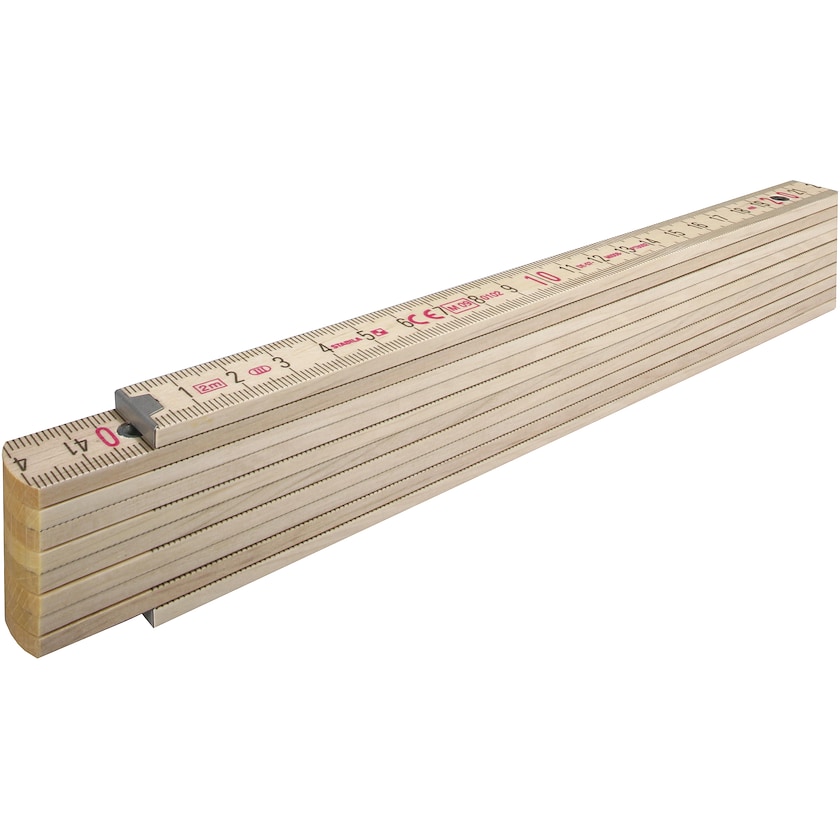 Metro pieghevole di legno con grande superficie di stampa. Le stecche sono molto vicine, per cui è facile stampare grafiche più complesse. Con snodi in acciaio. Il metro è conforme al certificato EC type-examination, EC-accuracy class III e EC conform.