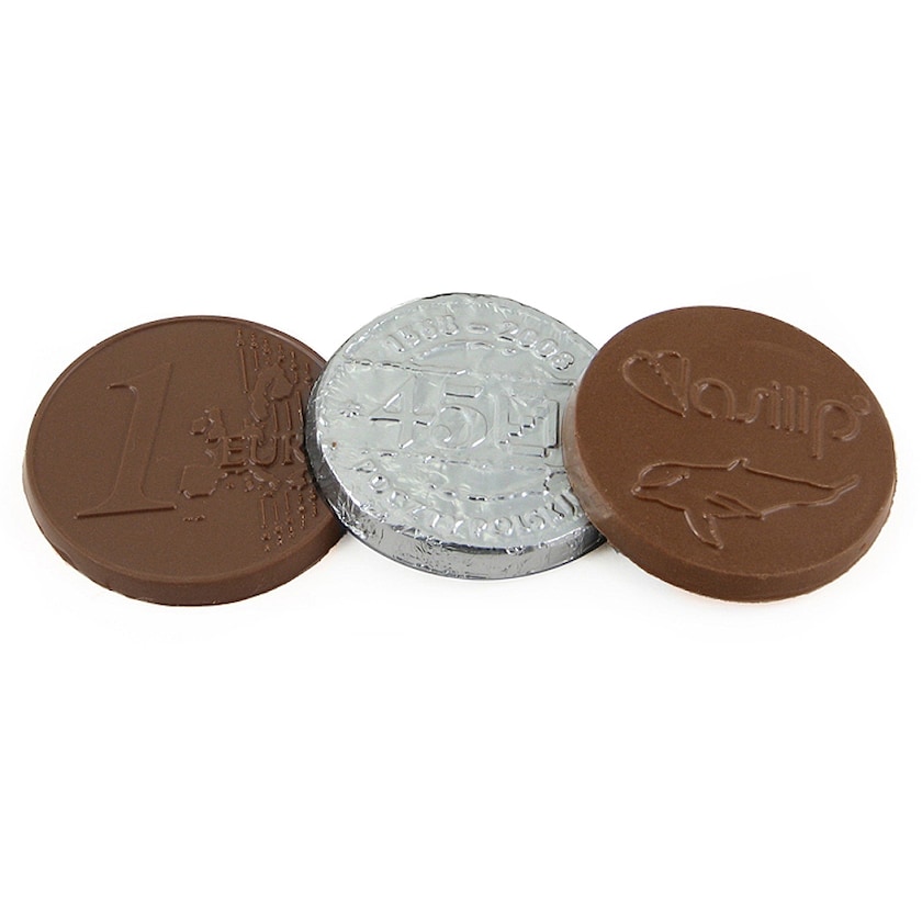 Moneta di cioccolato grande. Il tuo logo viene realizzato in rilievo direttamente sul cioccolato. Questa moneta è fatta di finissimo cioccolato belga. Scegli tra incarto argentato o dorato.