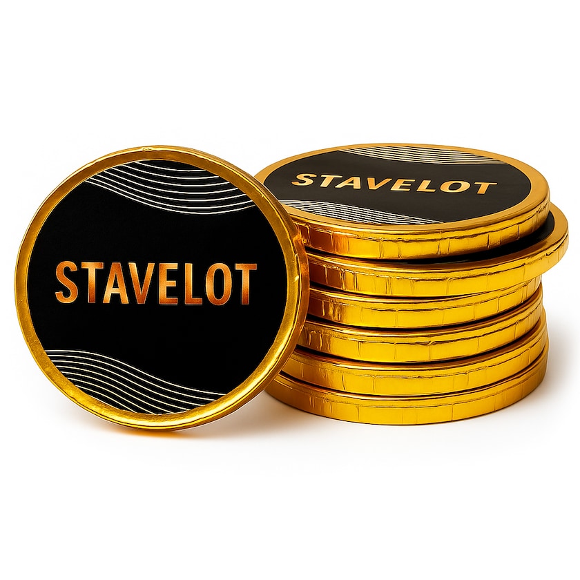Moneta di cioccolato con confezione dorata. Un'etichetta rotonda personalizzata con il tuo logo viene posizionata sul davanti. Il cioccolato è ai gusti misti al latte e fondente.