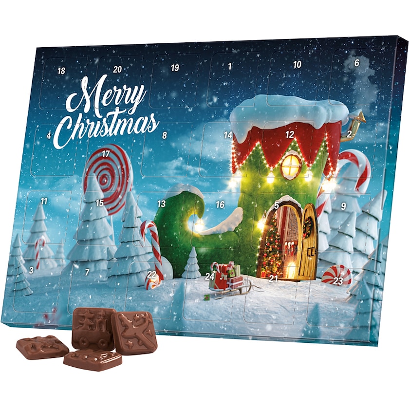 Calendario dell'Avvento da scrivania con gustoso cioccolato Fairtrade. Il cioccolato ha un cremoso gusto di cioccolato al latte. Grazie al sostegno sul retro può stare dritto sulla scrivania.