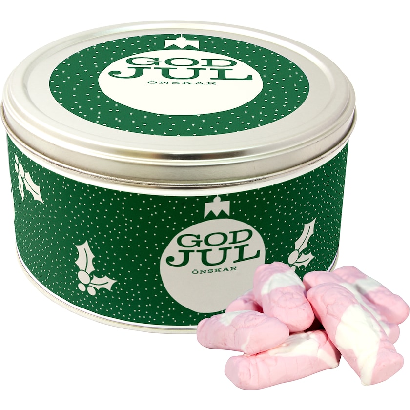 Scatola di Latta piena di Babbi Natale gommosi prodotti da Cloetta. Inclusa personalizzazione tramite stampa digitale su un'etichetta che verrà apposta sul lato della scatola e sul coperchio.