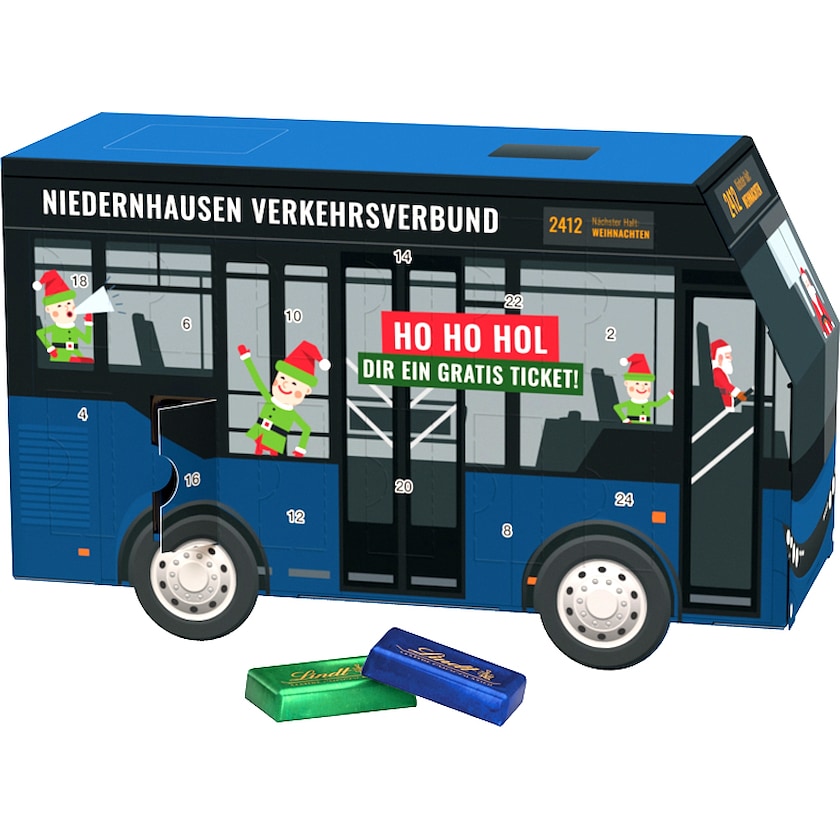 Calendario dell'avvento unico pieno di cioccolatini Lindt. I cioccolatini sono al latte e sono avvolti in incarti in tre colori diversi. Il preferito di tutti gli autisti di autobus.