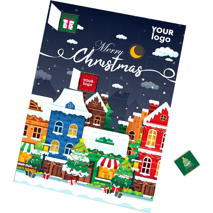 Calendario dell'avvento con cioccolatini quadrati personalizzati. Sia il calendario stesso che i cioccolatini vengono personalizzati secondo i tuoi desideri. Hai quindi la possibilità di creare un calendario dell'avvento completamente unico pieno di delizioso cioccolato. I cioccolatini sono disponibili in cioccolato al latte o fondenti.