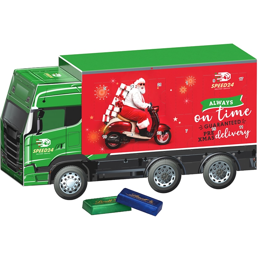 Un camion pieno di cioccolato al latte Lindt. Un calendario dell'avvento unico che si distingue. Perfetto per le aziende di trasporto. Il calendario dell'avvento è pieno di cioccolatini al latte Lindt con involucro in tre diversi colori.