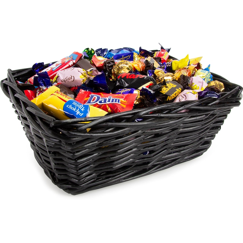 Cesto nero con dolcetti di qualità incartati. Contiene classici come Toblerone, Dumle, Geisha e Daim. Se vuoi il cesto può essere fornito di biglietto di auguri con fantasia natalizia.